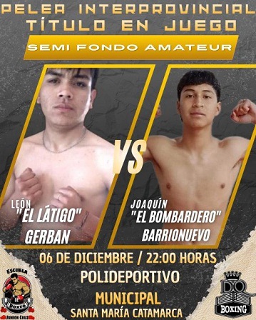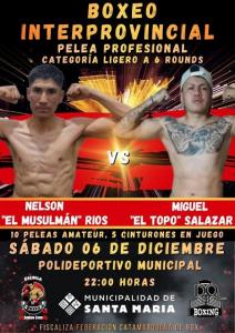 El evento se desarrollará en el Polideportivo Municipal, desde las 22 y con la fiscalización de la Fedreación Catamarequeña de Boxeo, y la lucha estelar será animada por los salteños Nelson “El Musulmán” Ríos (6-8-4 con 1 Ko) y Miguel “El Topo” Salazar (8-18-2 con 2 KO), enla divisional Ligero (hasta 61,234 Kg), a seis asaltos de duración.