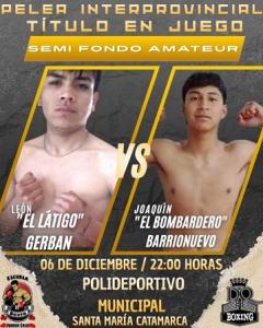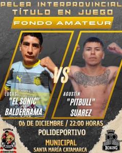 El local Agustín “El Pitbull” Suárez se medirá ante Lucas “El Sonic” Balderrama (Salta) en hasta 57 Kg; otro santamariano León “El Látigo” Gerván confrontará ante Joaquín “El Bombardero” Barrionuevo (Salta), en hasta 53 Kg.