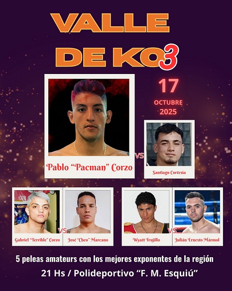 Organizado por Corzo Box Promotions, el próximo viernes 17 de octubre -desde las 21- se concretará el festival internacional “Valle de KO 3”.