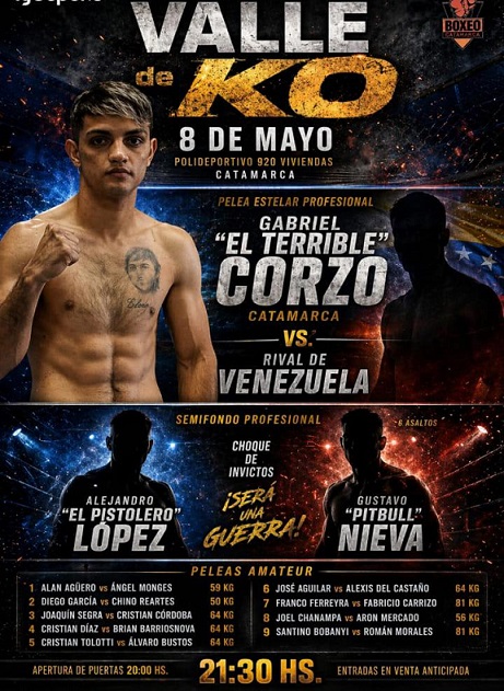 Organizado por Corzo Box y con fiscalización de la Federación Catamarqueña de Boxeo (FCB), la apertura de las puertas para el evento será a las 20 y se prevé venta de entradas anticipadas, con precio a confirmar.